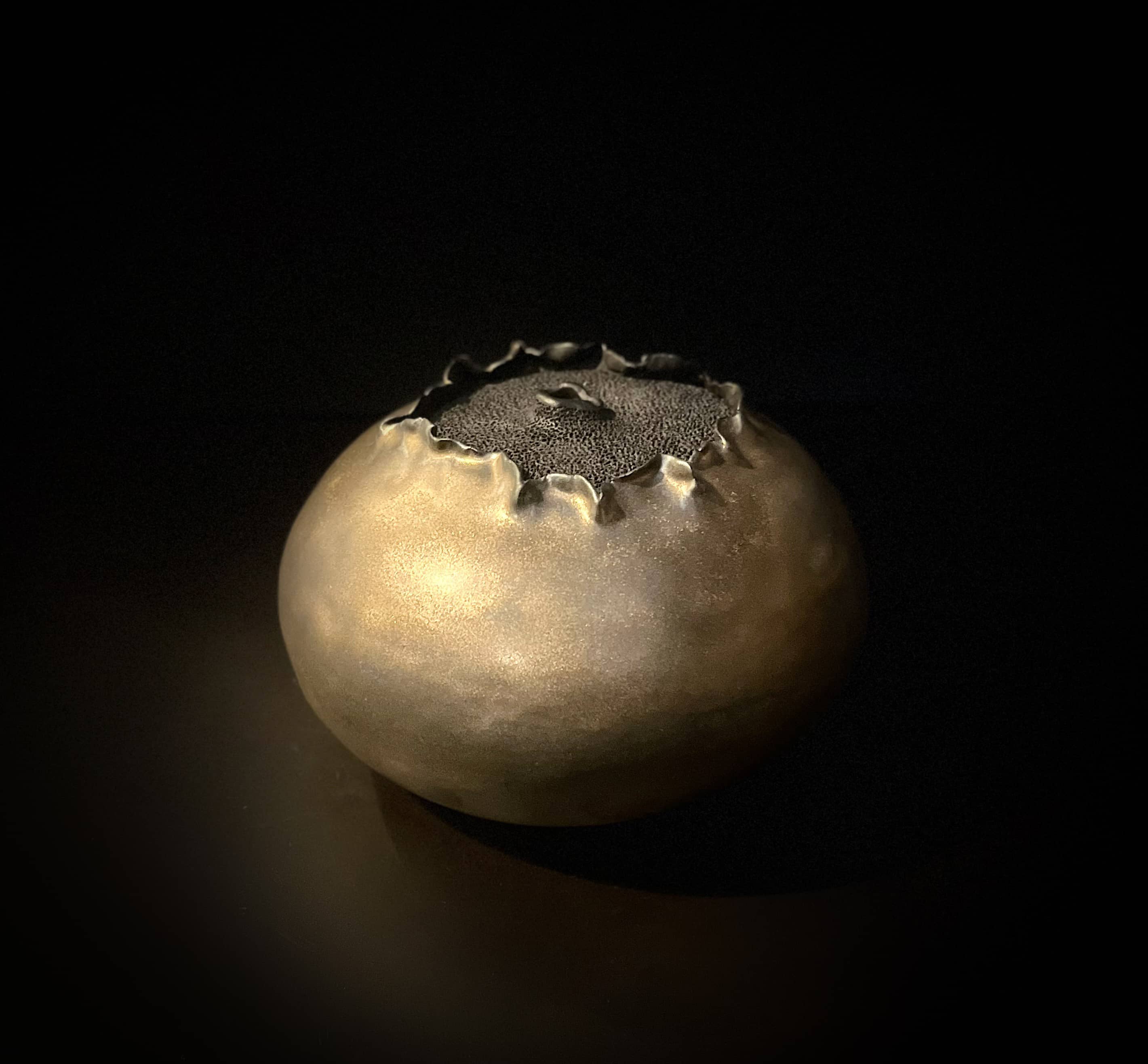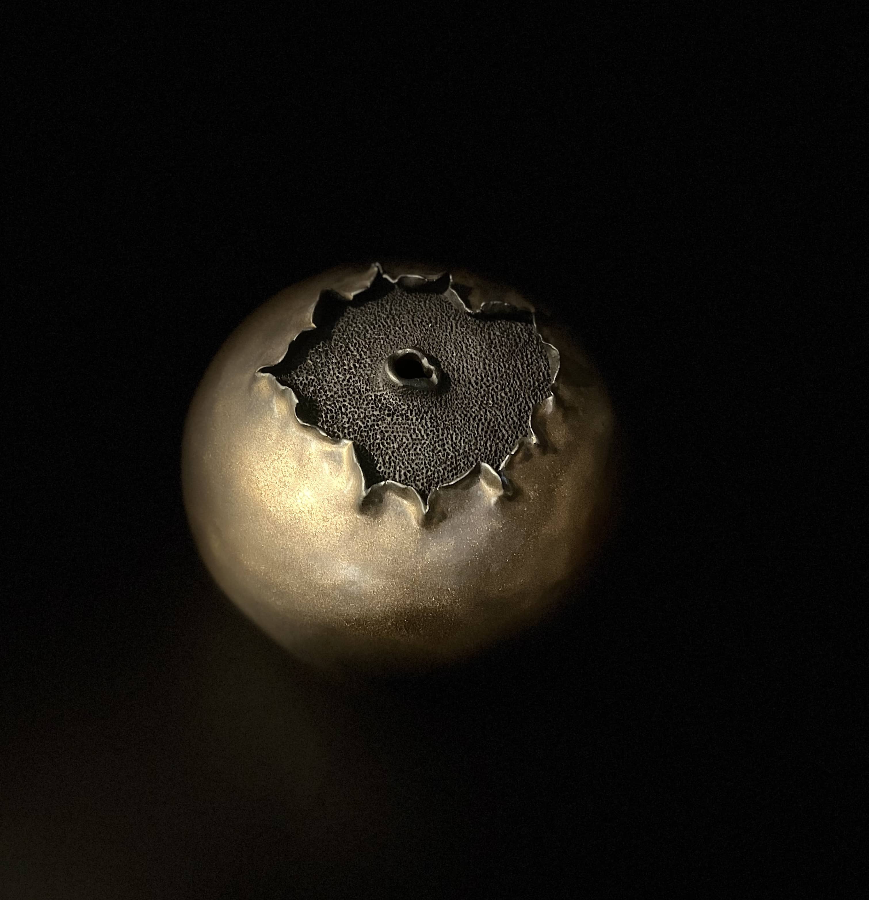 Alex carries a closed body marked at its crown. The form is built from deep black Nigra clay. An antique gold glaze partially covers the exterior surface. At the top, the surface opens into a recessed field of dense, manually perforated texture. The glaze pulls back at the edge of the opening, breaking and settling unevenly rather than smoothing the form. Light gathers on the glazed surface, while the exposed texture remains dark and absorbent. The contrast between glaze and clay determines the object’s presence.