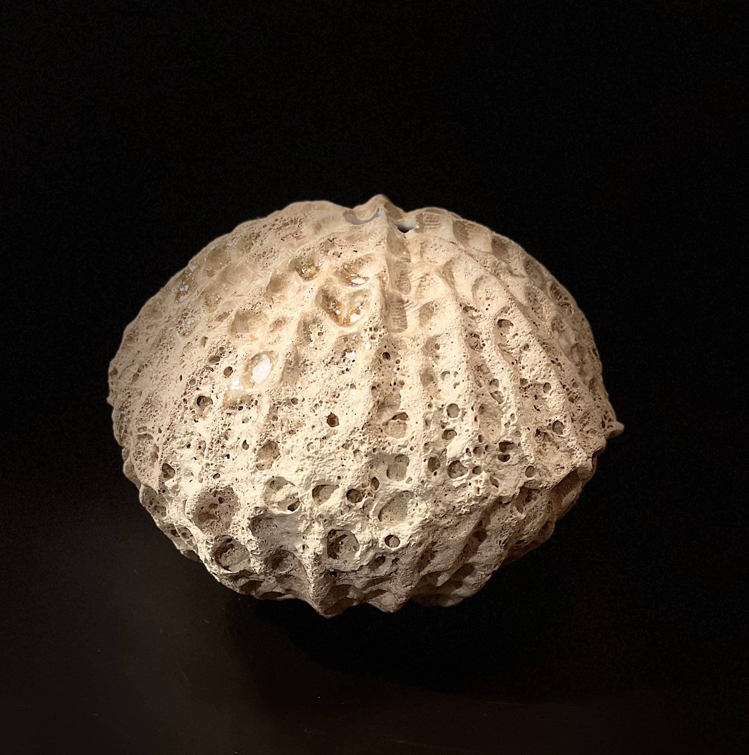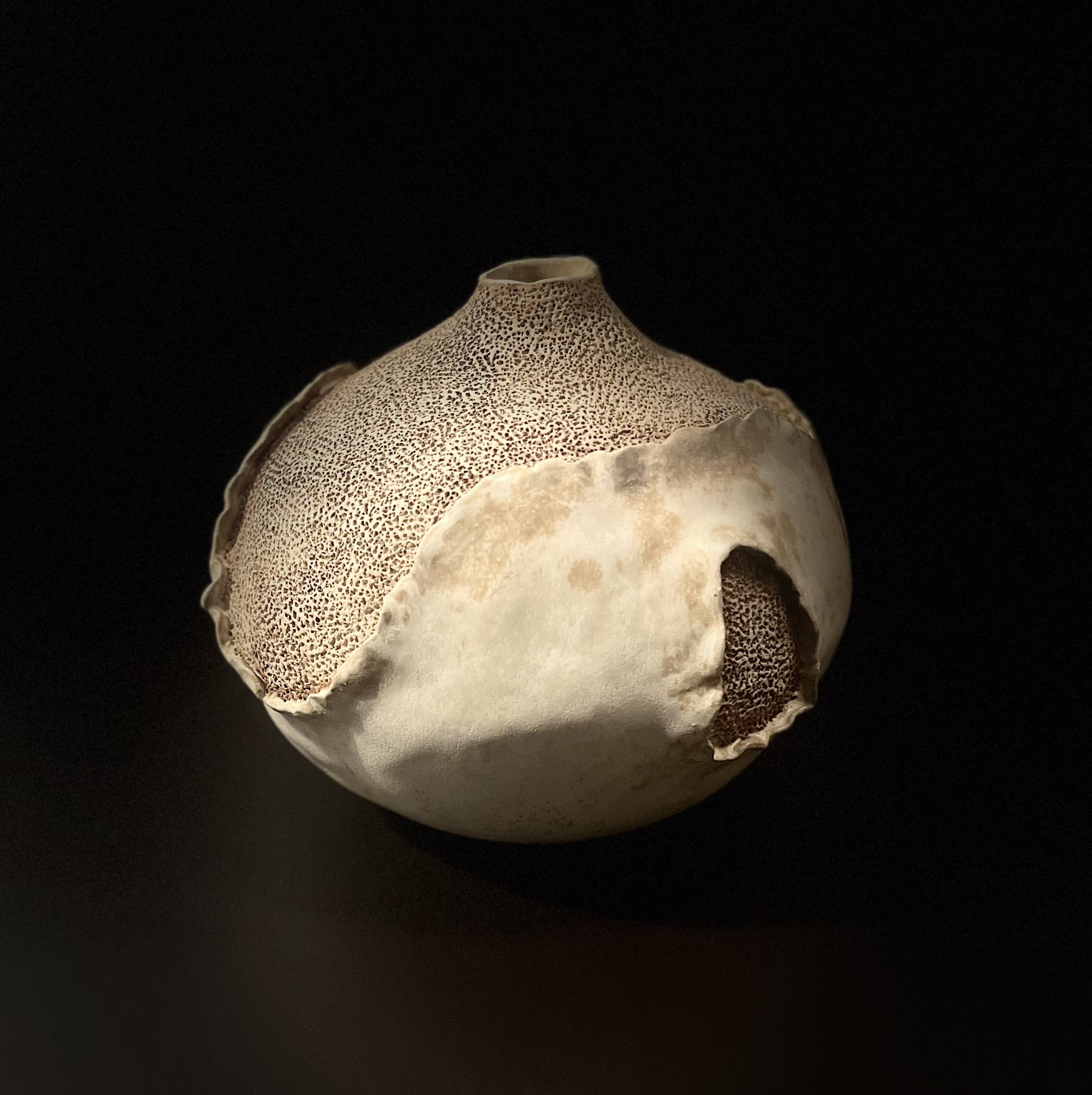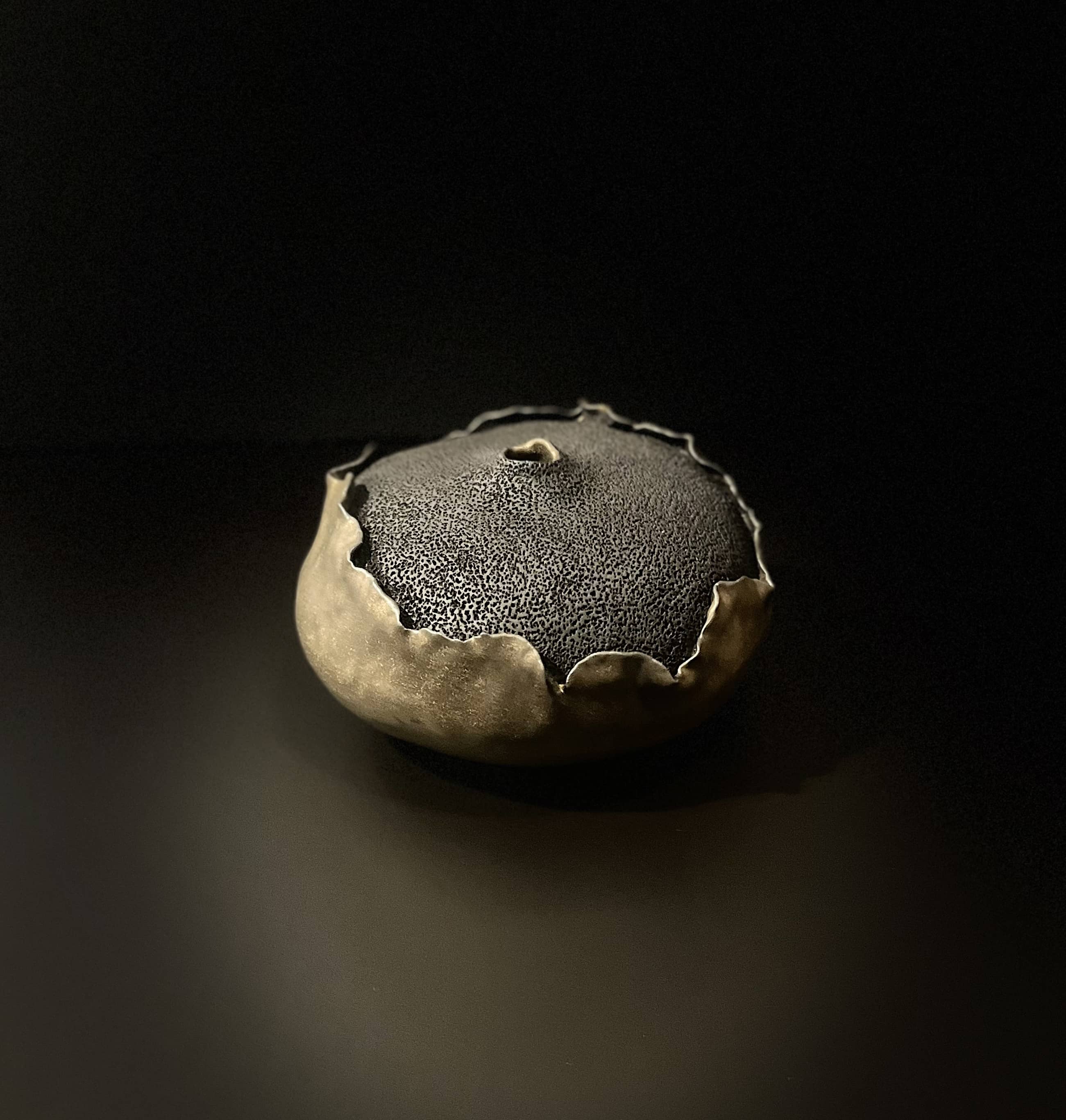 Lava Bloom captures a moment between flow and stillness. The dark, porous surface evokes cooled magma, while the soft metallic edge folds like a petal touched by heat. Light moves across its contours, revealing both strength and fragility — an elemental bloom born from fire and pressure.