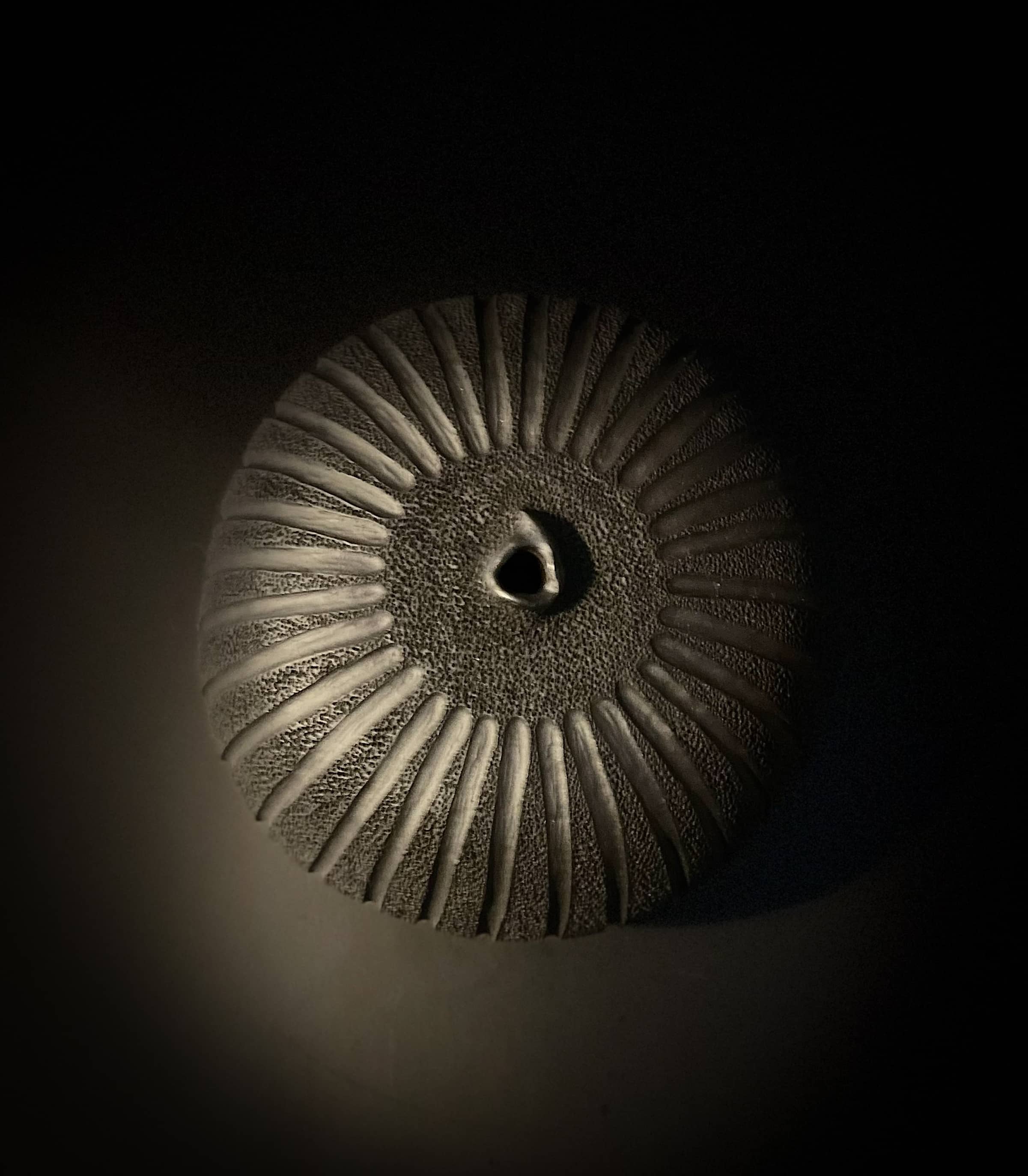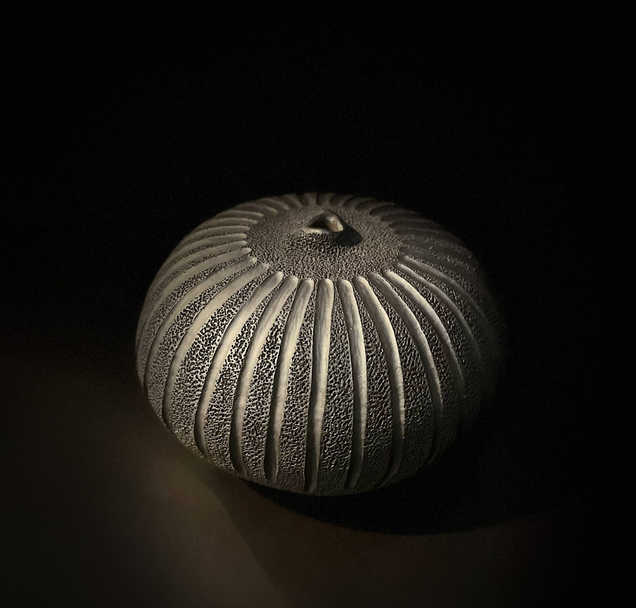 Unglazed object made from deep black Nigra clay. The form is closed and restrained.A geometric structure holds the body together, while the surface remains open. Thousands of small perforations are set by hand. They interrupt the order, allowing light and depth to enter the surface. What appears solid reveals itself as layered, counted, and permeable.