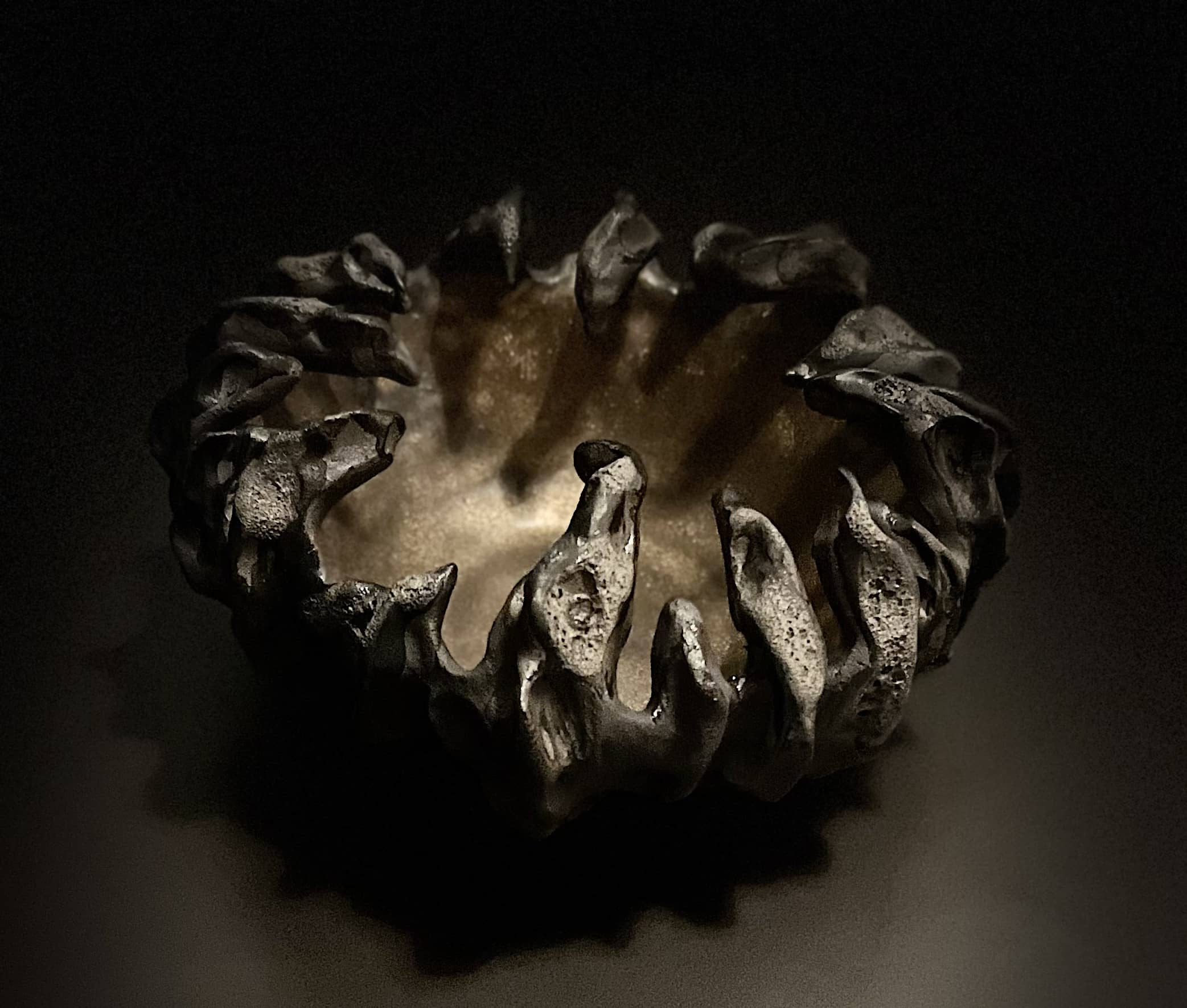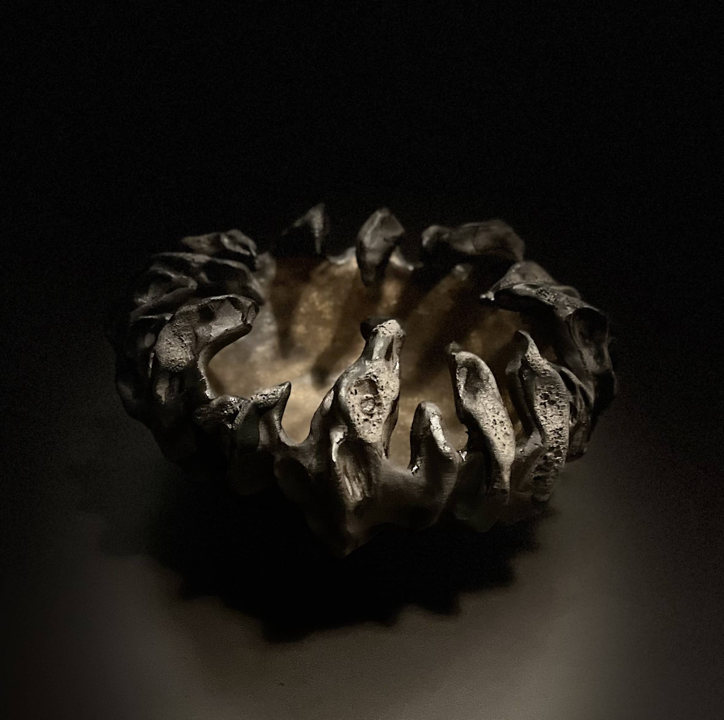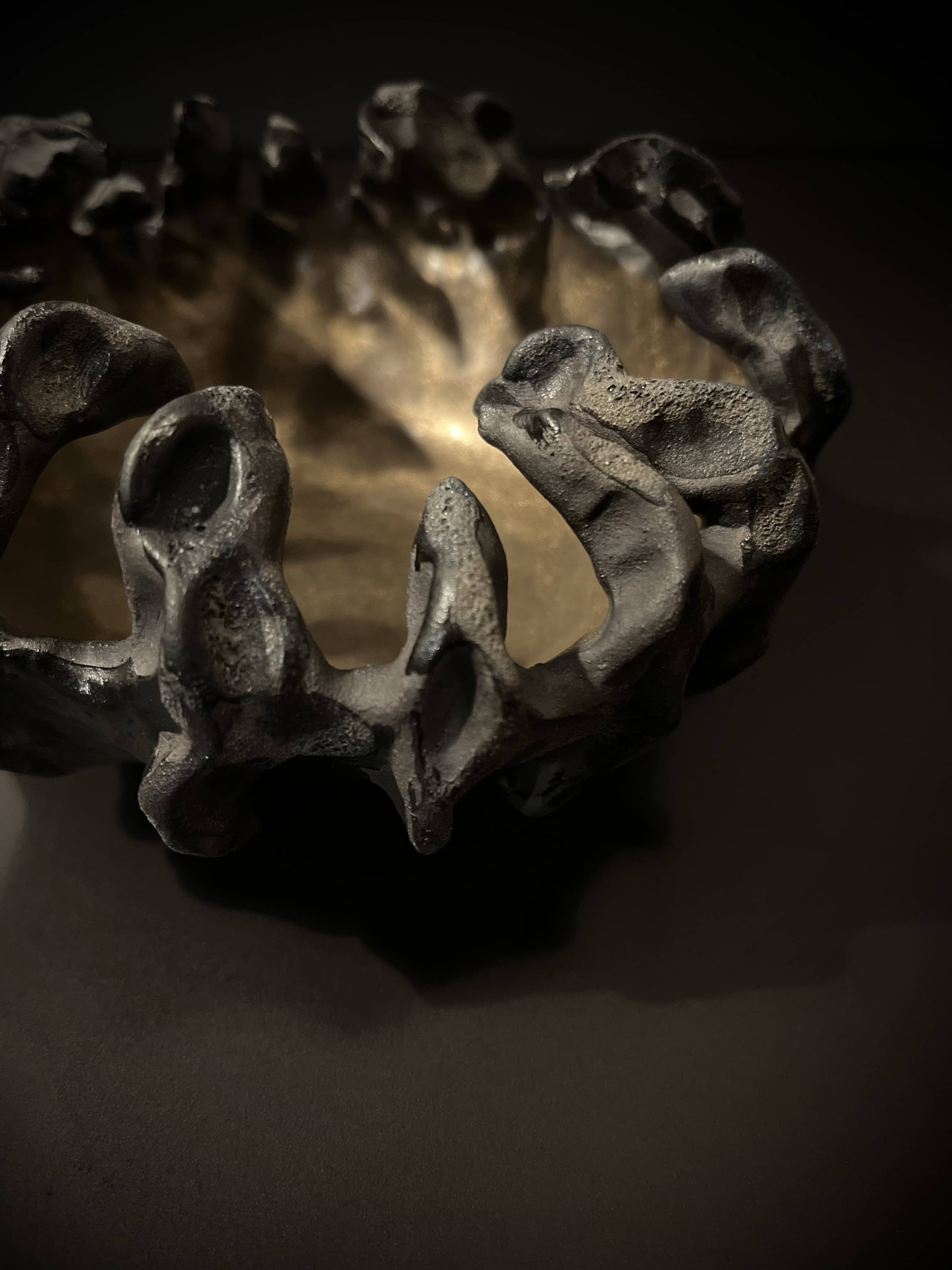 Formed by hand in stoneware, Mara gathers movement at its edge — a ring of rising, shifting shapes that feel almost alive. The interior carries a muted metallic glow, while the dark, textured rim seems carved by fire and tide. Made to be held close, the piece balances raw gesture with intimate scale, inviting a moment of pause and a quiet sense of presence.