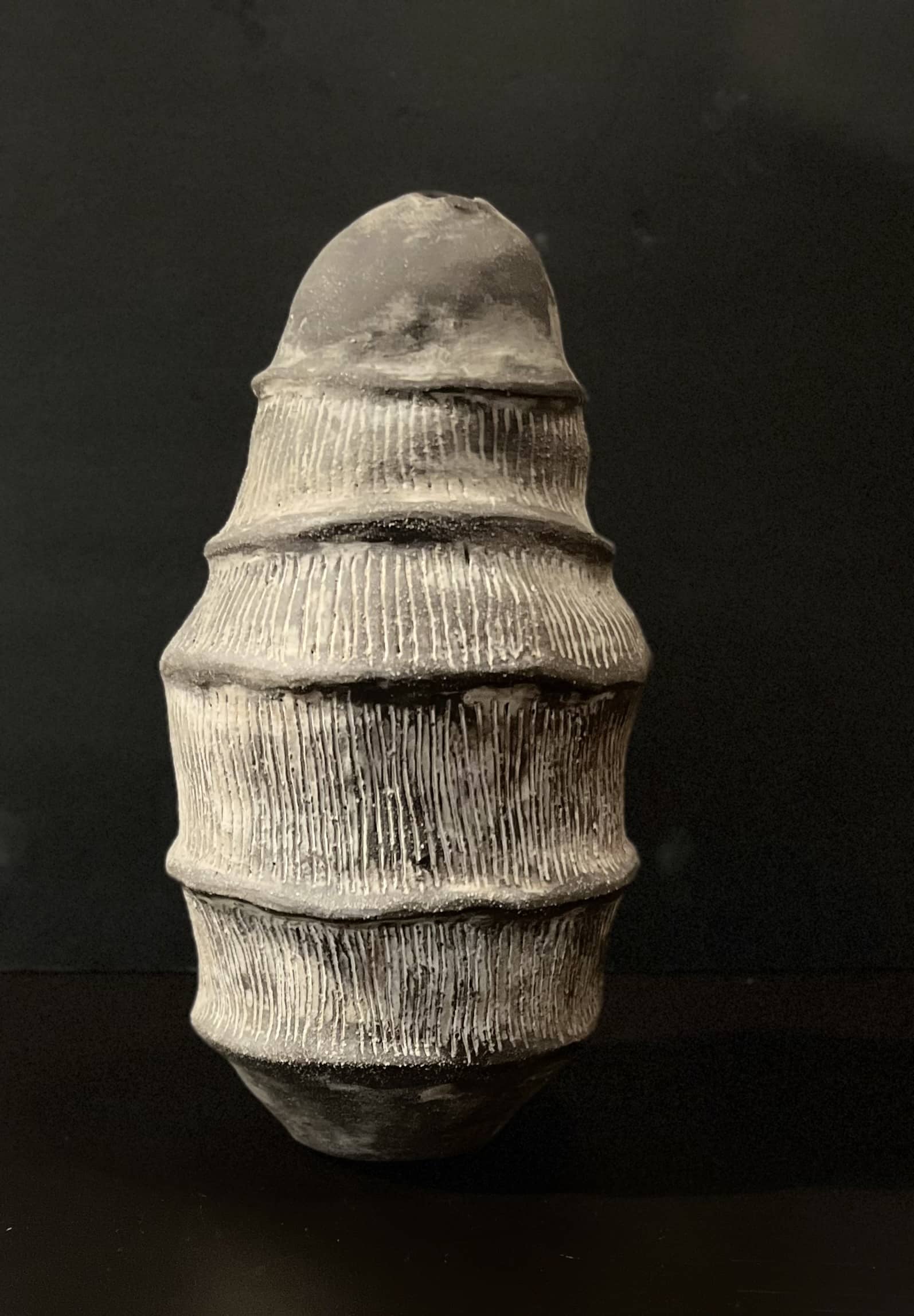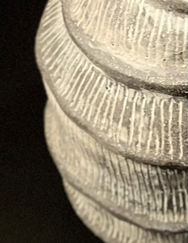Hand-built in layered segments, Milo carries a quiet, grounded presence. The surface is finished only with slip, giving the form a soft, almost chalky tactility that invites the fingertips. Each ridge is shaped one by one, creating a rhythm that feels both organic and intentional. The unglazed top keeps the piece raw and honest, like a fragment of something weathered by time rather than polished by it.
