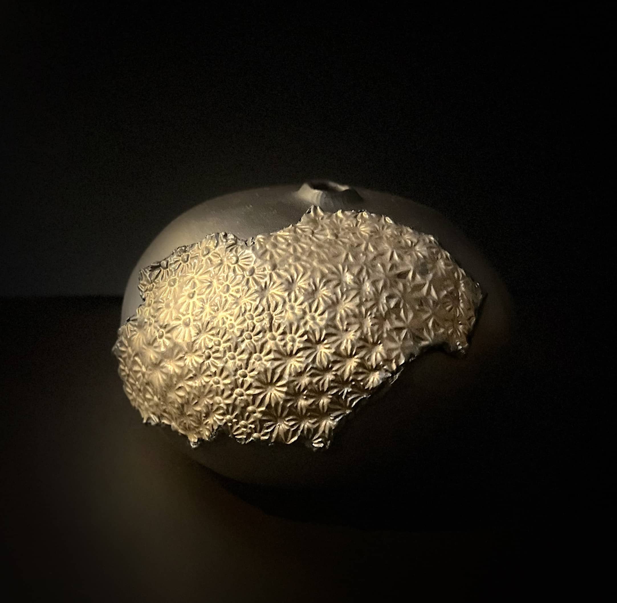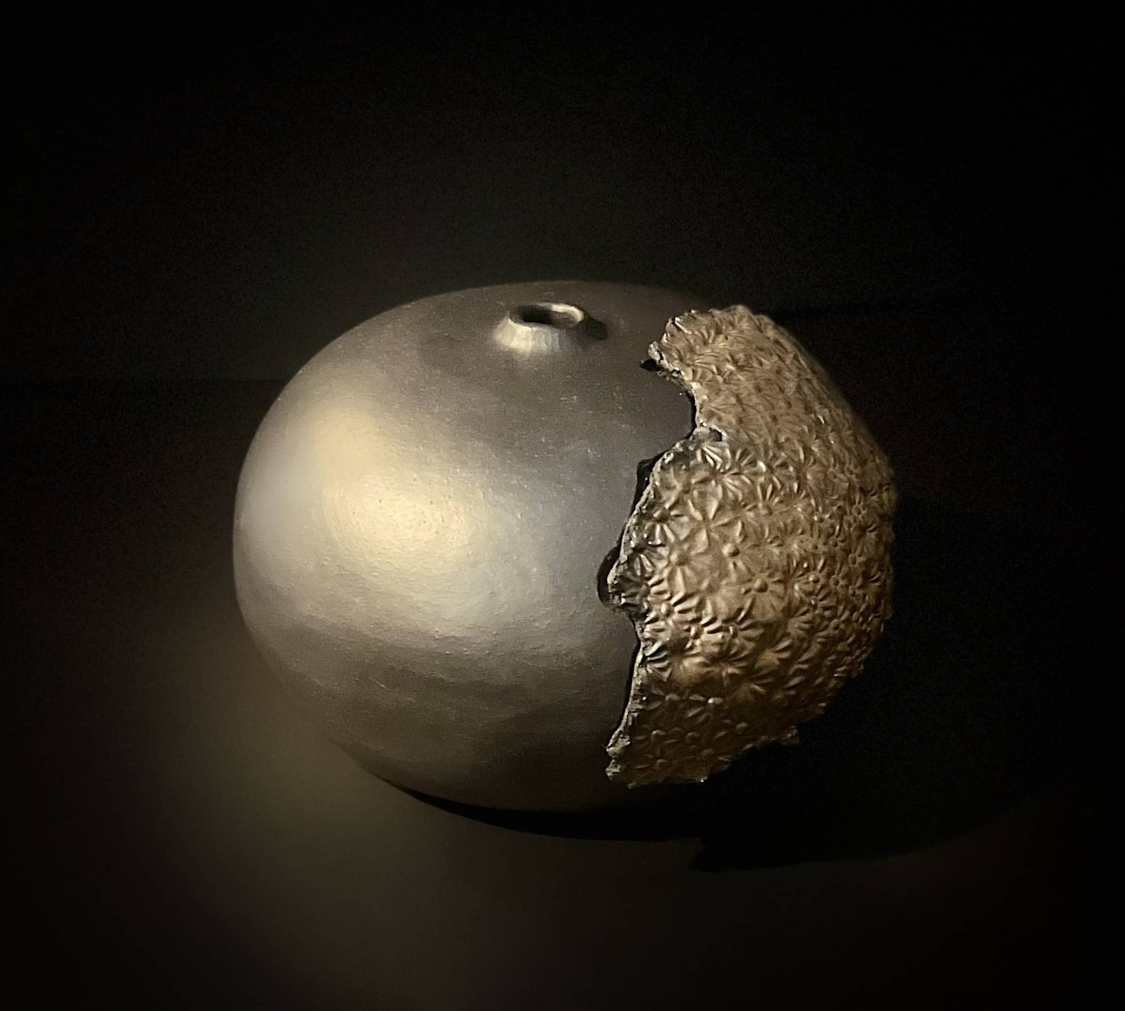 Monday carries the impact of a foreign fragment. The body is formed from deep black Nigra clay, remaining unglazed and light-absorbing. A shard from another object is embedded into the exterior surface, as if struck onto the form. Its floral structure is partially glazed in an antique gold tone, introducing reflection and a different material language. The glaze pools and breaks across the fragment, emphasizing relief rather than smoothing it.Dark clay and glazed shard meet abruptly, holding tension between surface, interruption, and weight. The object reads as compact and restrained, marked by an encounter rather than a transition.