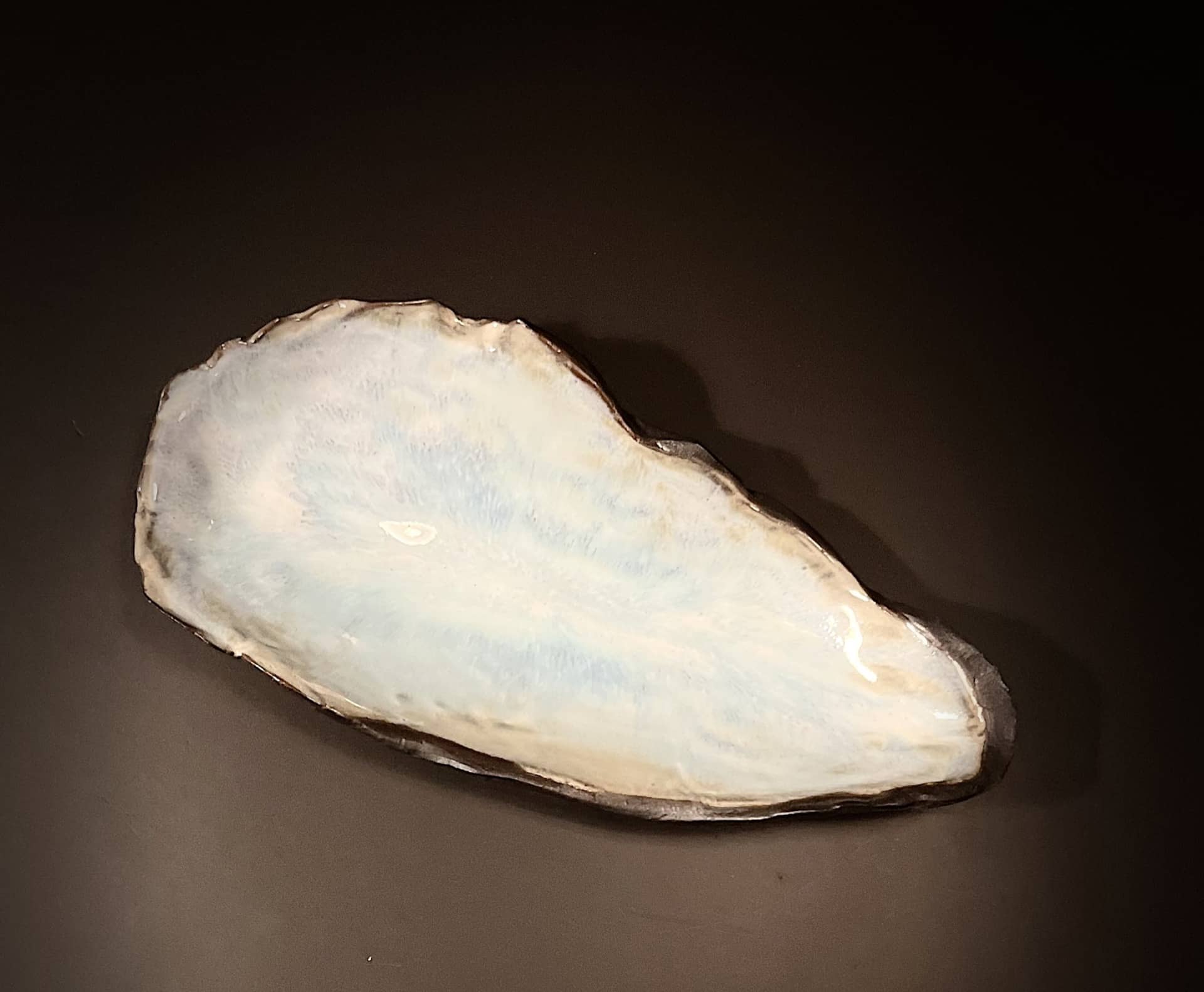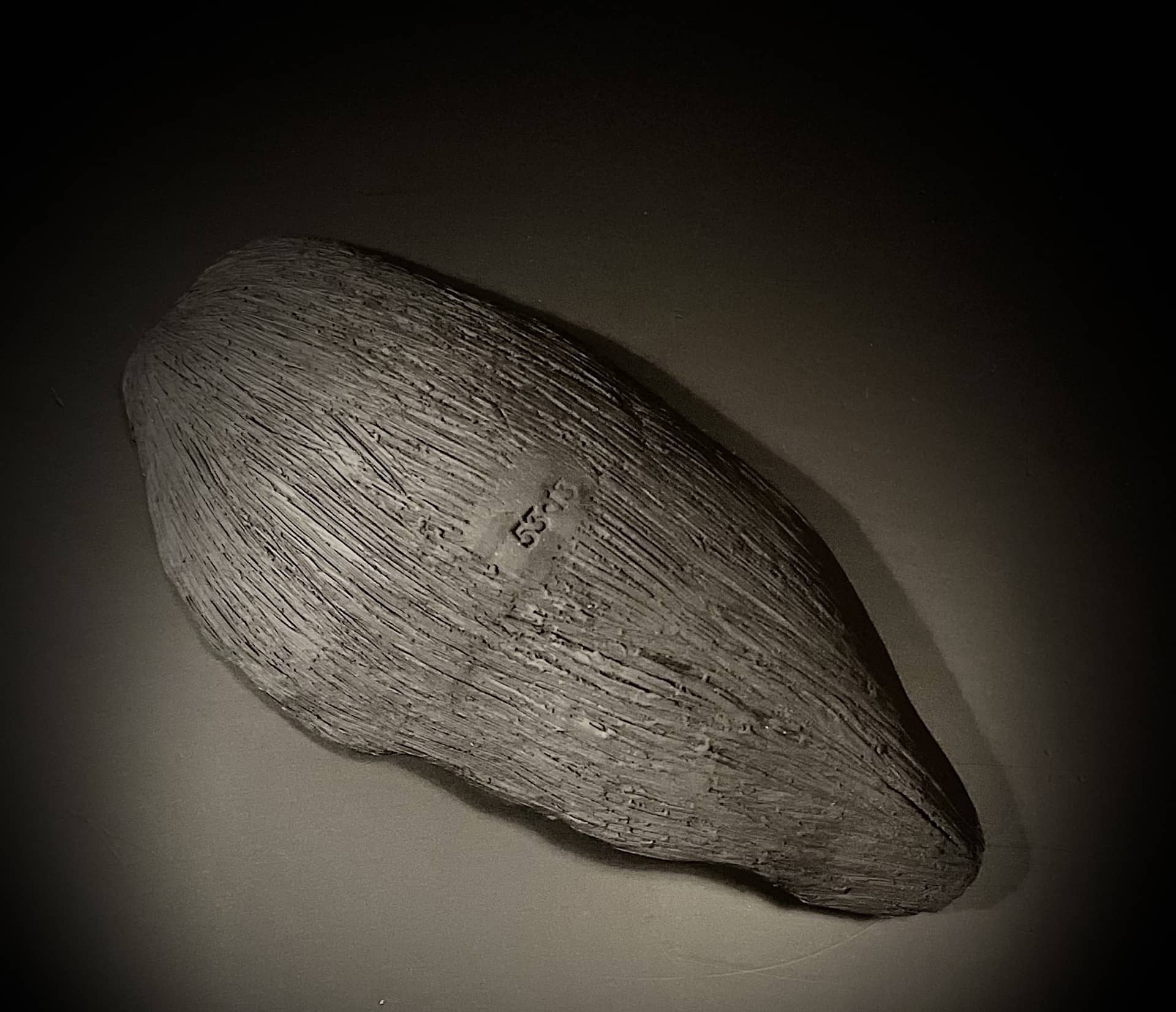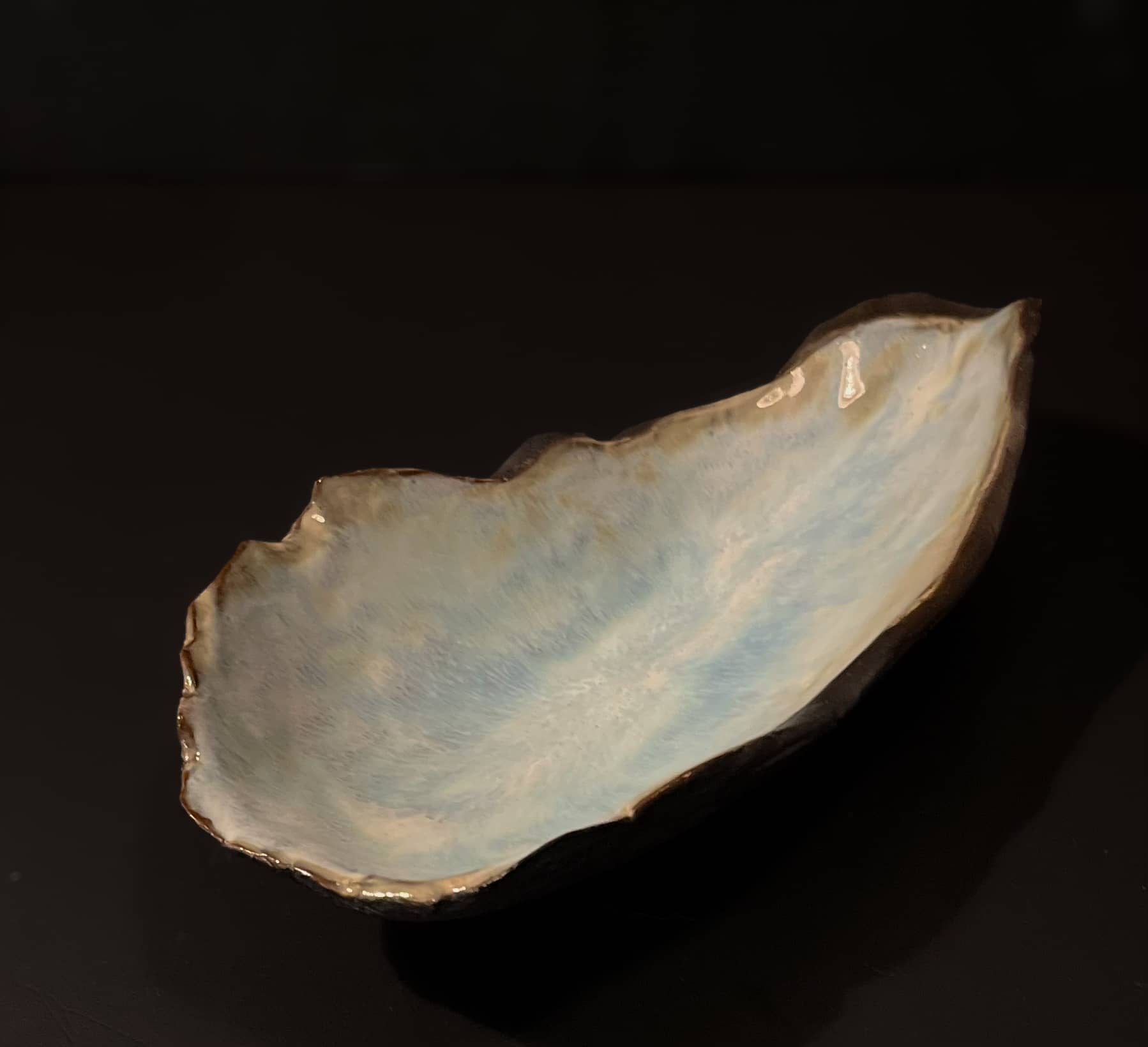 Hand-built in dark stoneware, MUREX echoes the long, tapered outline of a shoreline shell—quiet, stretched, and shaped by motion. The exterior is left unglazed, its carved grain catching the light like weathered driftwood. Inside, a soft, luminous glaze creates a contrast of depth and sheen, as if holding a pocket of sea-wash. It feels like something lifted from a tide line: familiar, organic, and slightly otherworldly.