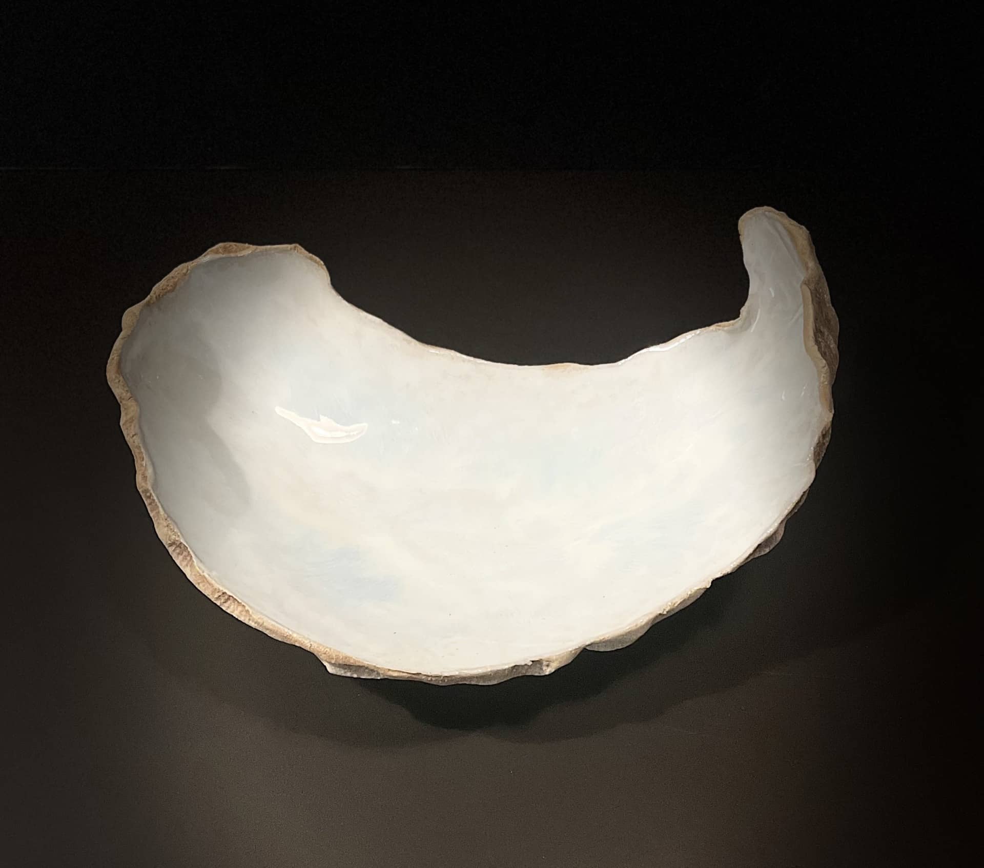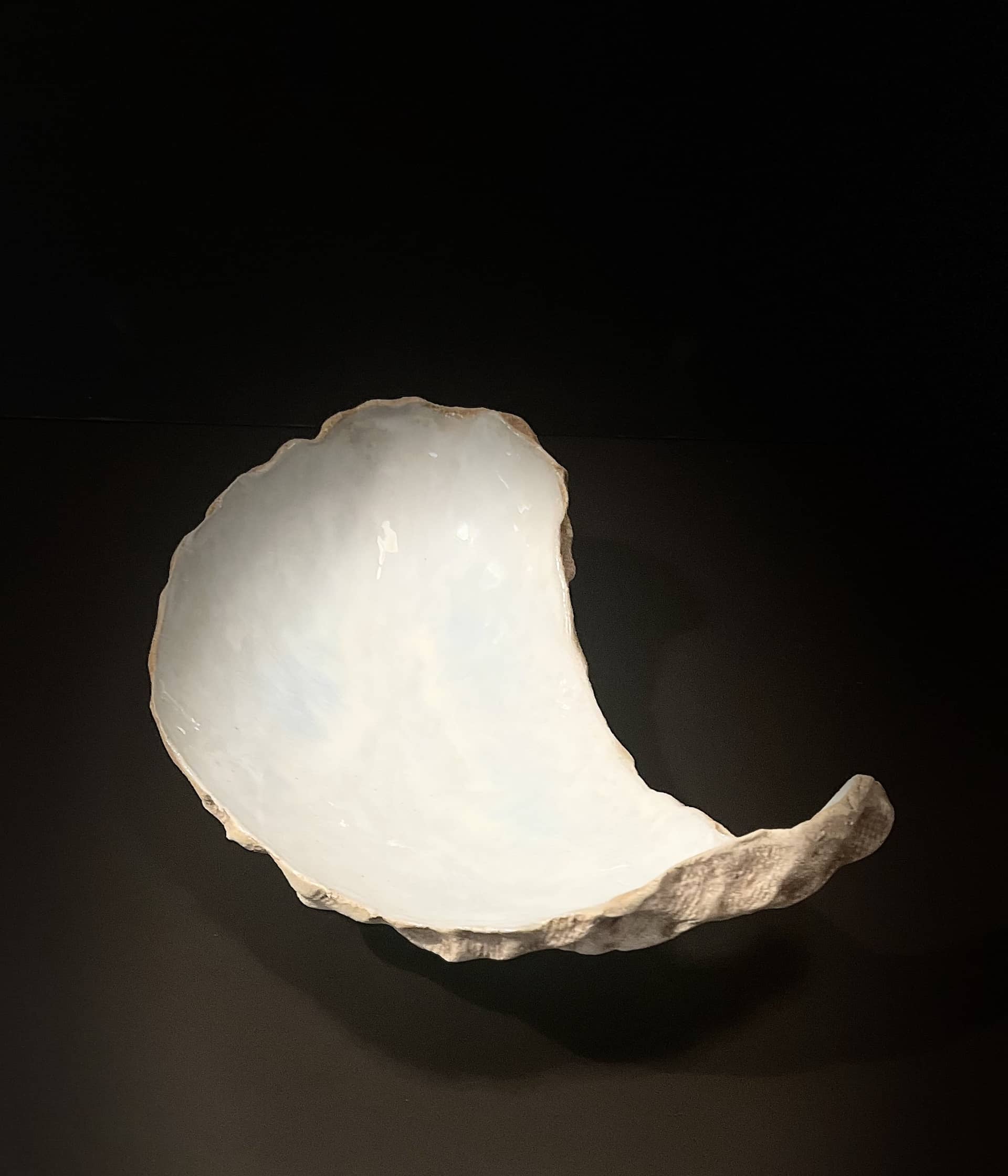 Inspired by the curved silhouette of an oyster shell, this piece carries its texture like a natural archive — ridges shaped by time, pressure and repetition. The surface remains unglazed and pigmented, giving it a dry, mineral tactility, while the underside reveals gentle curves that feel almost anatomical. A fragment of shoreline, caught mid-gesture.