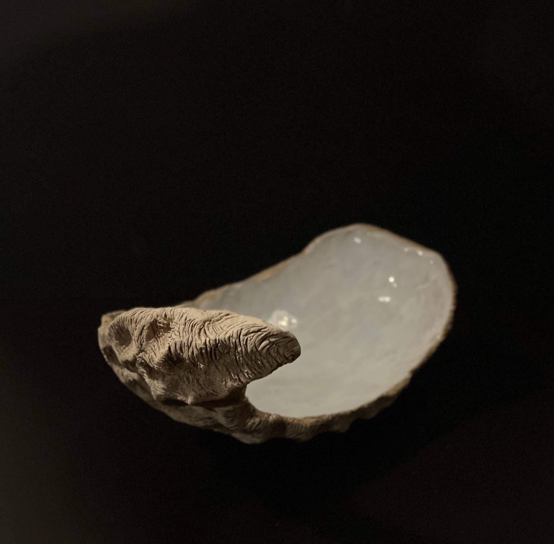 This variation leans closer to the raw presence of a weathered shell. The textured surface is built from layered impressions, each one breaking the light differently, giving the form a quiet rhythm. Unglazed and pigmented, it recalls something lifted from the tide line — softened, eroded, and still carrying the memory of water.