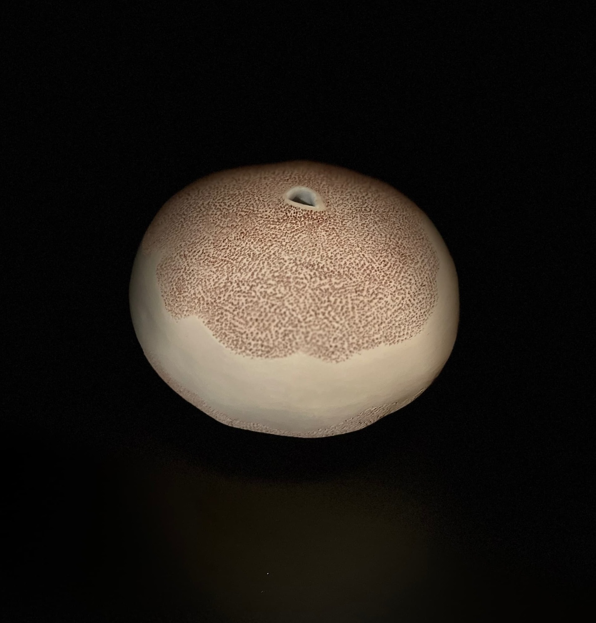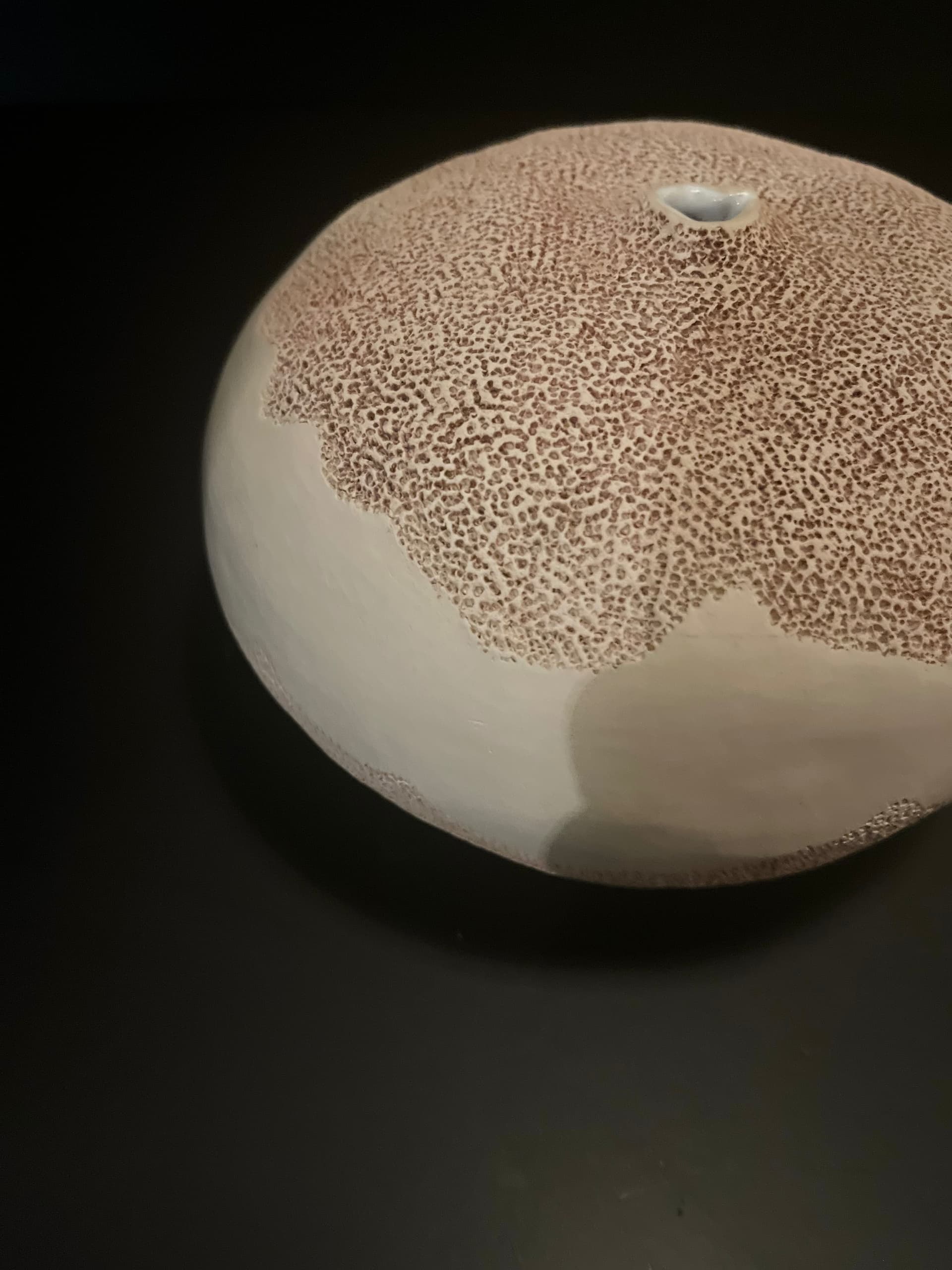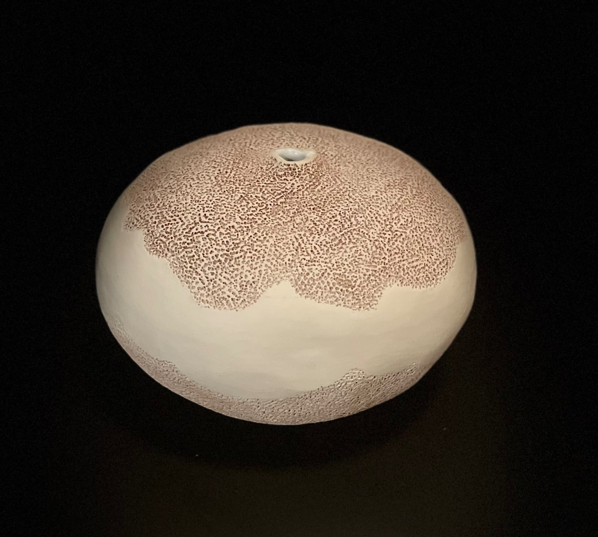 SIV I combines a soft, rounded volume with a textured band that reads like a layer shaped by time. The exterior is unglazed, tinted with iron oxide pigments and sealed with Liquid Quartz to keep the matte surface clean. Inside, a white glaze reflects light. A quiet form with a grounded, tactile presence.