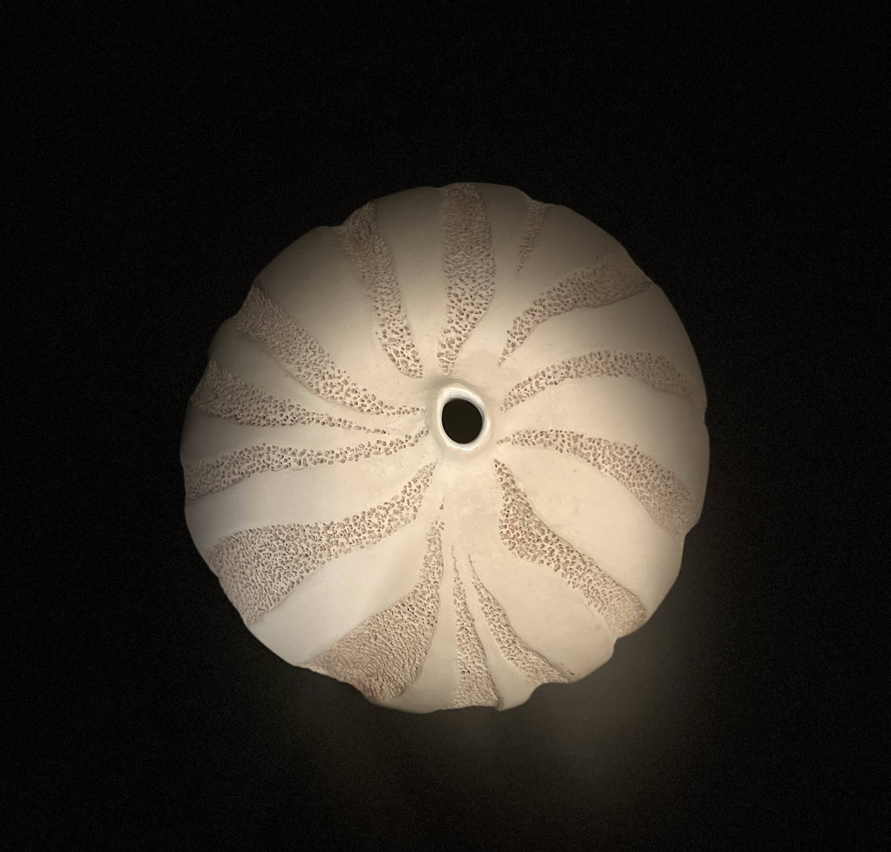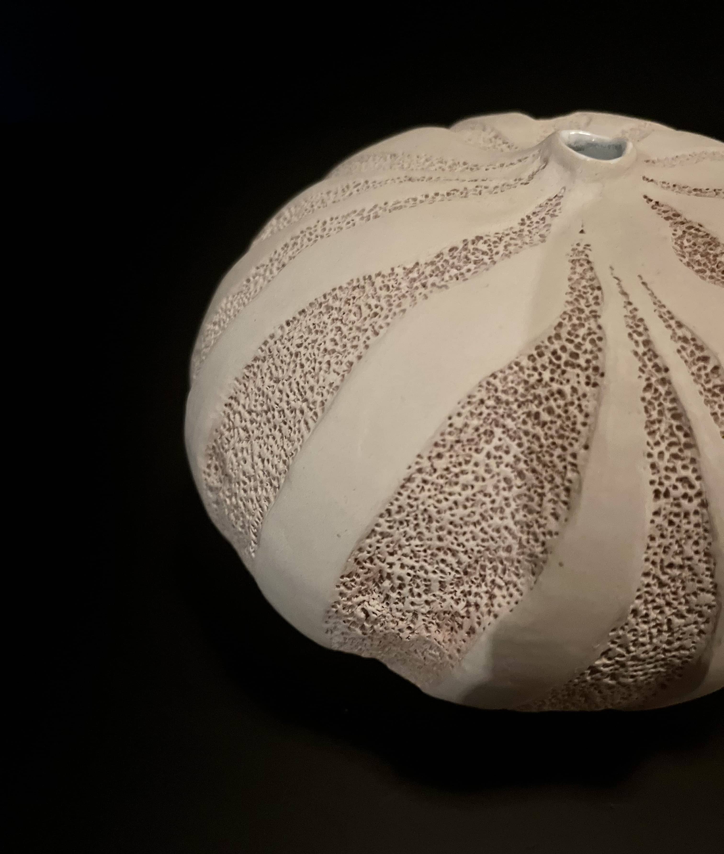 SIV III introduces more movement: the textured areas follow a gentle spiral that suggests flow, erosion or growth. Iron oxide pigments deepen the surface, which stays unglazed and sealed with Liquid Quartz to preserve its matte feel. The white glazed interior adds a bright counterpoint. A form that sits between stillness and motion.